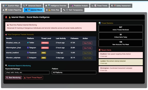 Islamist Watch: Tracks radical Islamist activity across social media in realtime, providing actionable threat levels and live alerts.