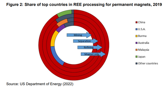 The concentration of REE mining, processing and refining in a limited number of countries, most notably China has resulted in geopolitical tensions, economic dependencies and strategic manoeuvring among global powers. China’s dominance in REE production and its previous export restrictions have highlighted the potential for these essential materials to serve as geopolitical leverage.